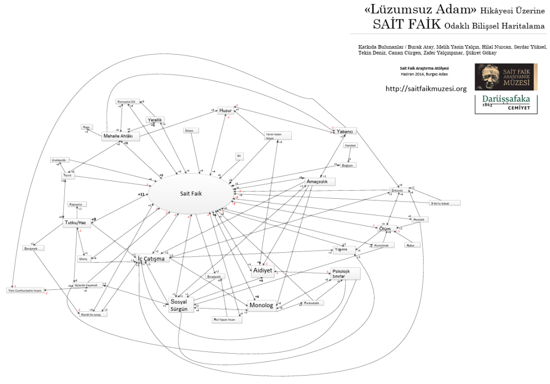 Sait Faik’in “Lüzumsuz Adam” adlı hikâyesinin merkez alındığı atölye çalışmasında iki aşamalı odaklanma yöntemiyle çeşitli sosyolojik, psikolojik, dilbilimsel ve edebî çözümlemeler etkileşimli olarak katılımcılar ve moderatörler tarafından dile getirildi. Forum sonucunda ortaya çıkan 40’a yakın kavram ve kavramlar arasındaki etkileşimler dört adet bilişsel haritayla temsil edilerek araştırma sürecine dâhil oldu.