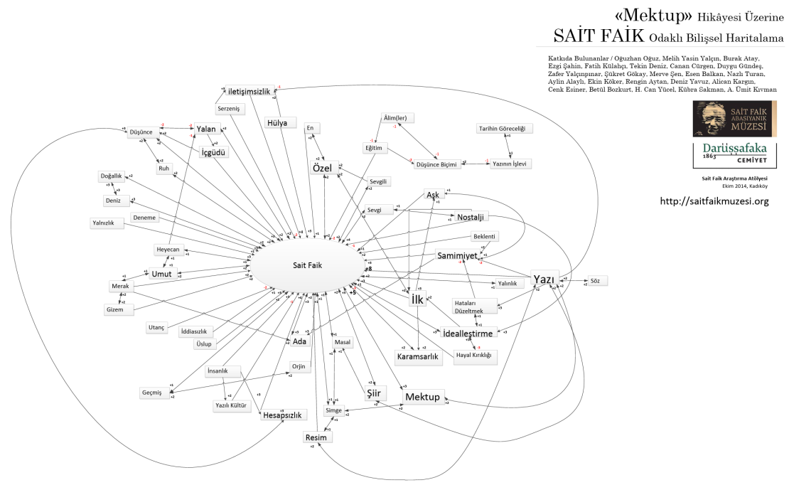 Sait Faik’in “Mektup” adlı hikâyesinin merkez alındığı atölye çalışmasında çeşitli sosyolojik, psikolojik, dilbilimsel ve edebî çözümlemeler etkileşimli olarak katılımcılar ve moderatörler tarafından dile getirildi. Oturum sonucunda ortaya çıkan 50’ye yakın kavram ve kavramlar arasındaki etkileşimler beş adet bilişsel haritayla temsil edilerek araştırma sürecine dâhil oldu.