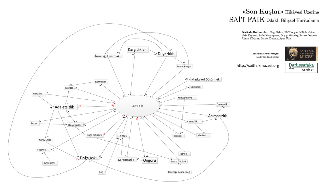 Sait Faik’in “Son Kuşlar” adlı hikâyesinin merkez alındığı atölye çalışmasında çeşitli sosyolojik, psikolojik, dilbilimsel ve edebî çözümlemeler etkileşimli olarak katılımcılar ve moderatörler tarafından dile getirildi. Oturum sonucunda ortaya çıkan 40’a yakın kavram ve kavramlar arasındaki etkileşimler beş adet bilişsel haritayla temsil edilerek araştırma sürecine dâhil oldu.